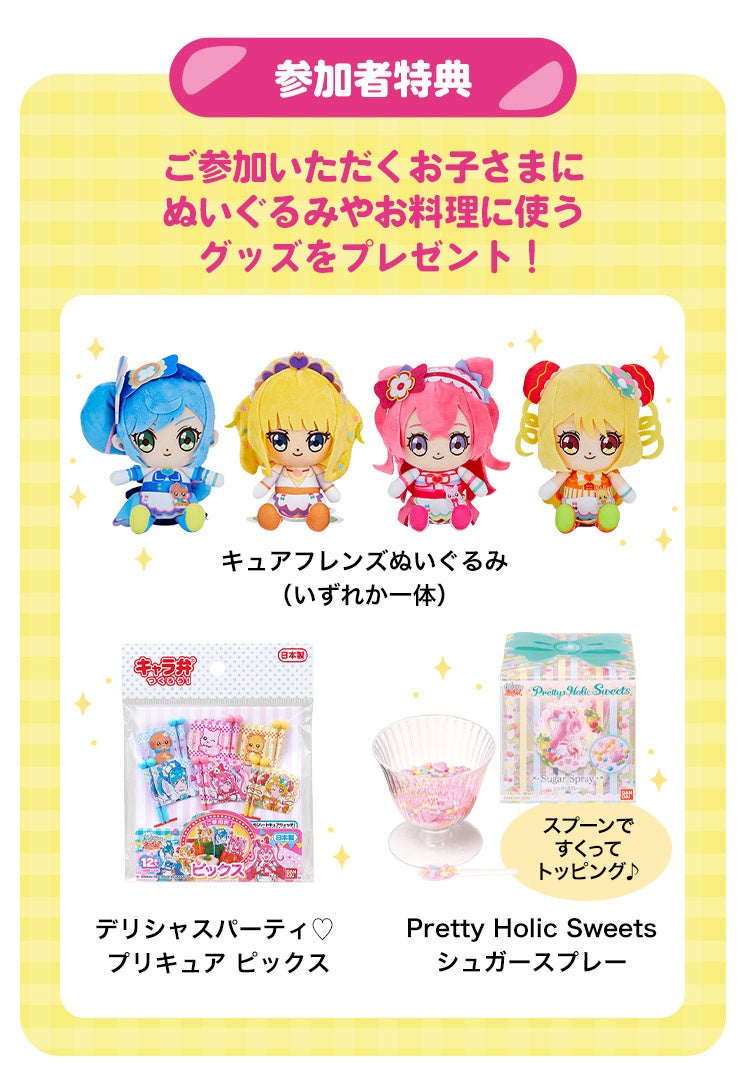 ご参加いただくお子さまに「デリシャスパーティ♡プリキュア」のぬいぐるみやお料理に使うグッズをプレゼント!