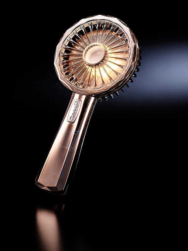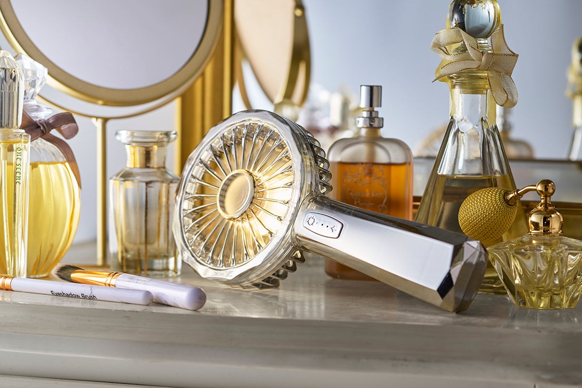 横向きで使用することができ、卓上ファンとしてもお使いいただけます。仕事中や、汗をかきたくない身支度の際に便利。きらめくデザインが、気分を上げてくれます。