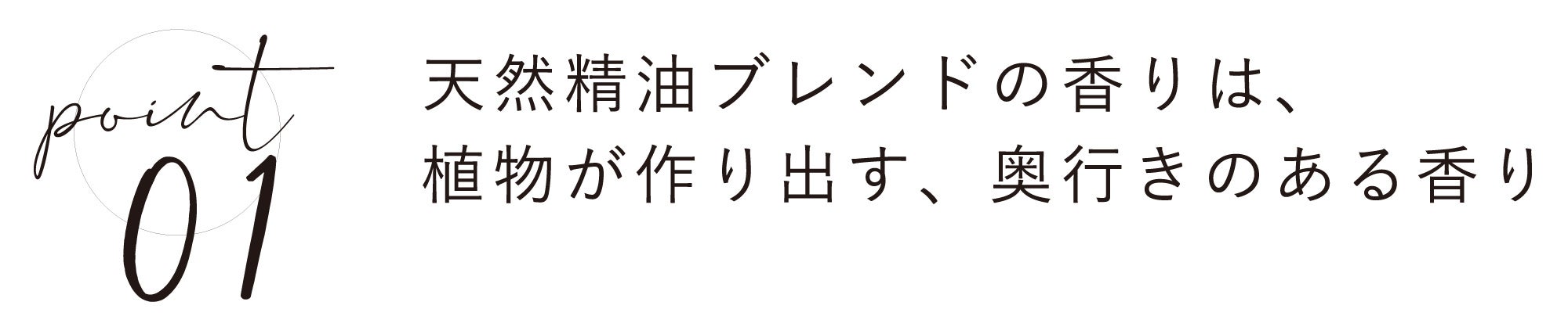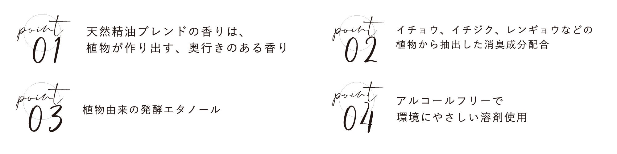 目に見えずとも大きな力を持った"香り"は、一歩踏み出したい日常の生活シーンに合わせて、置く場所や使用する時間を選べます。ミスト・エアーフレッシュナーに配合されている消臭成分は、天然由来の植物成分です。