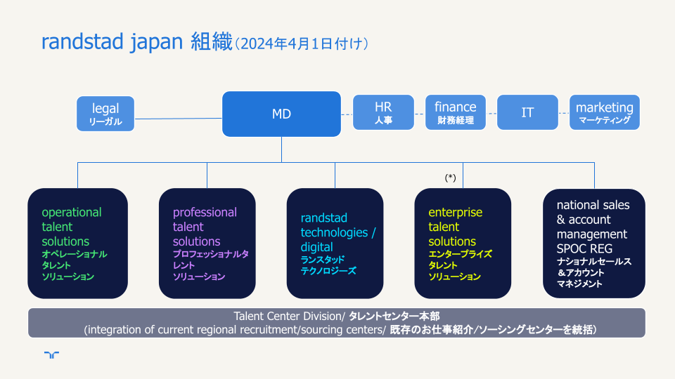 深刻な人材不足や今後ますます進むAIの浸透など人材を取り巻く課題は多く、各企業はより専門的なサポートを求めています。また人生100年時代を迎え働き方の多様化が進み、働き手の雇用主に対する期待値が上がるなか、人材のライフステージに応じた成功願望に寄り添い、真のパートナーとして有意義な仕事につけるよう支援することが求められています。この度の組織改正では4つの専門分野(オペレーショナル/ プロフェッショナル/ デジタル/ エンタープライズ)を通じてクライアント企業と人材をサポートする体制に生まれ変わります。
