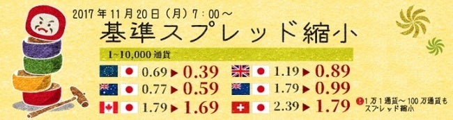 今般2017年11月17日(金)まで実施していたスプレッド縮小キャンペーンにおいて、多くのお客さまからご好評をいただいていることから、2017年11月20日(月)より「基準スプレッド」にてご提供することとなりました。