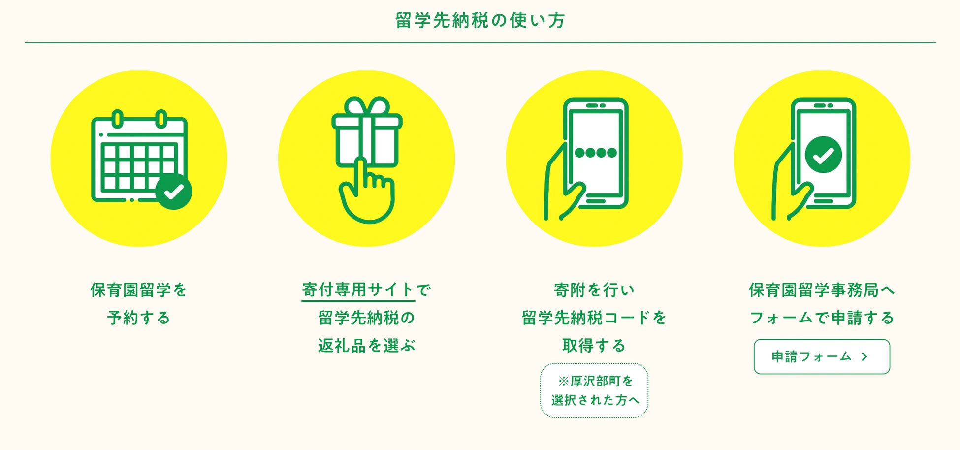 留学先納税®とは、「保育園留学」の費用の一部を、ふるさと納税の新しい形である「旅先納税®︎」(※4)の返礼品で支払うことのできる仕組みです。留学先納税®を行うことで、返礼品としてオンラインコード「留学先納税コード」を受け取り、留学負担金額の一部として充当することが可能です。