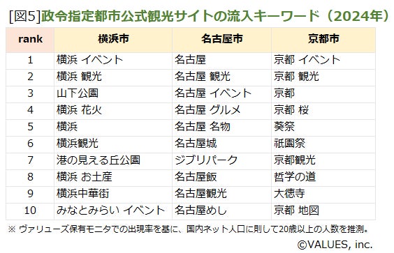 全国のヴァリューズモニター(20歳以上男女)の協力により、各都道府県公式観光情報サイト、および政令指定都市公式観光サイトについて、2024年と2023年の年間推計閲覧者数を集計し比較を行った。さらに、2024年1月~12月の1年間において、推計閲覧者が多かった都道府県公式観光情報サイトのランディングページ、および政令指定都市公式観光サイトへの流入ワードを集計した。