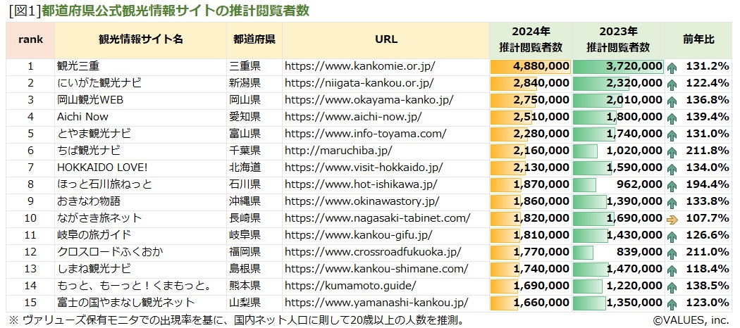 インターネット行動ログ分析によるマーケティング調査・コンサルティングサービスを提供する株式会社ヴァリューズ(本社:東京都港区、代表取締役社長:辻本 秀幸)と、公益社団法人日本観光振興協会(本部:東京都港区、会長:菰田 正信)は協同で、2024年の都道府県・政令指定都市別の公式観光サイト年間推計閲覧者数を調査しました。