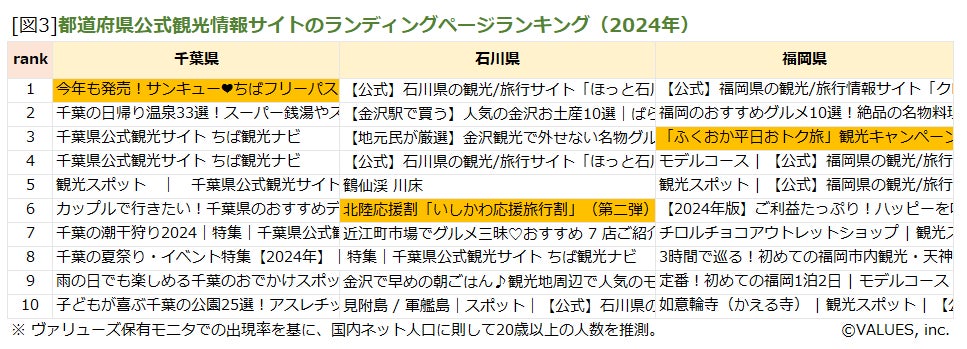 閲覧者数の前年比が高かった千葉県、石川県、福岡県ですが、どのようなコンテンツがよく閲覧されていたのでしょうか。各公式観光サイトのランディングページのうち、2024年の1年間でセッション数(閲覧回数)が多かった順にランキング化しました[図3]。