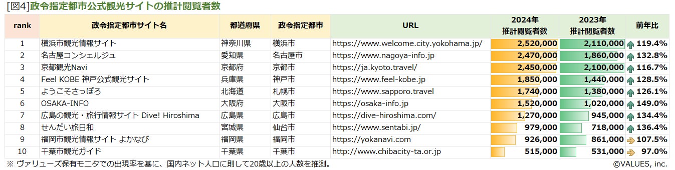 続いて全国の政令指定都市の公式観光サイトについても、推計閲覧者数を集計し2023年と比較しました [図4]。大半のサイトで前年比100%を超えており、1位横浜市(252万人)、2位名古屋市(247万人)、3位京都市(245万人)、4位神戸市(185万人)、5位札幌市(174万人)となっています。