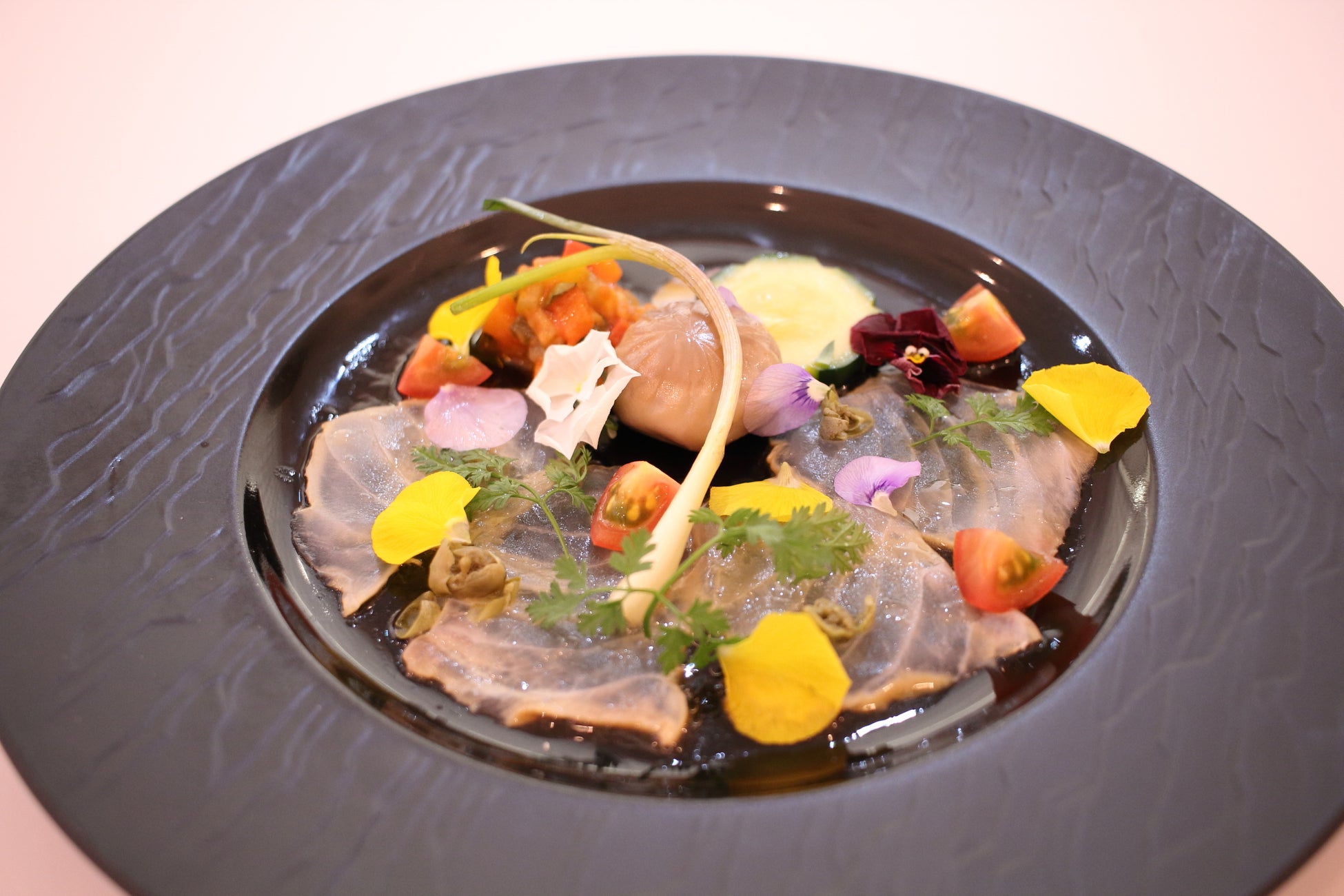□式根島真鯛のカルパッチョ 東京諸島食材:〈大島〉食用椿油、〈新島〉島らっきょう、〈式根島〉真鯛、〈母島〉島レモン醤油