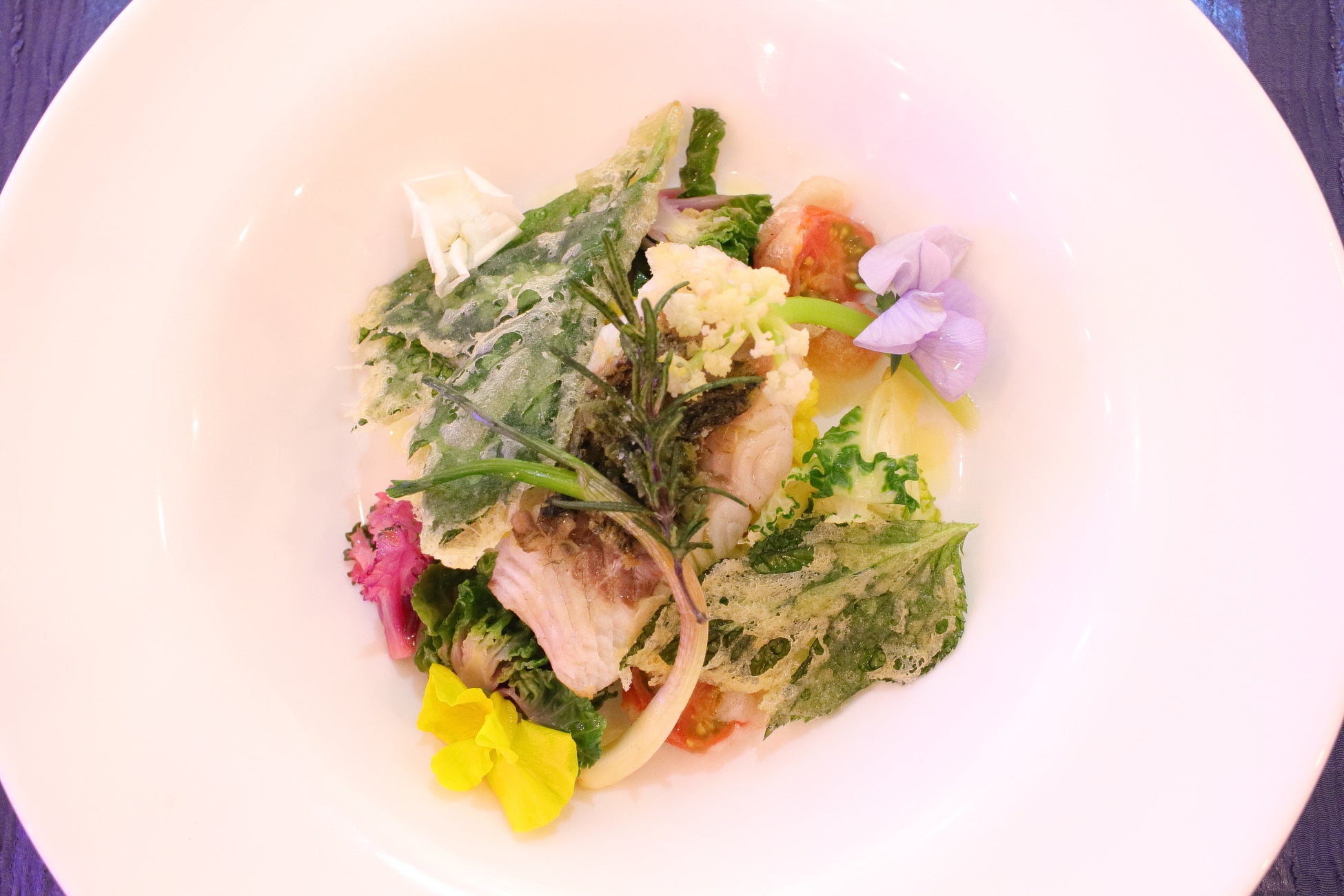 □スズキと明日葉のグリル 東京諸島食材:〈利島〉明日葉椿油ソース、〈新島〉スティックカリフラワー、島らっきょう、プチヴェール、〈三宅島〉明日葉、〈青ヶ島〉ひんぎゃの塩