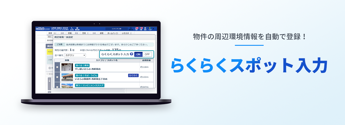 その課題を解決する「らくらくスポット入力」は、物件住所の緯度・経度から周辺施設情報を取得し、自動で登録します。これにより通常10分ほどかかる周辺施設情報の登録が、約30秒に短縮されます。