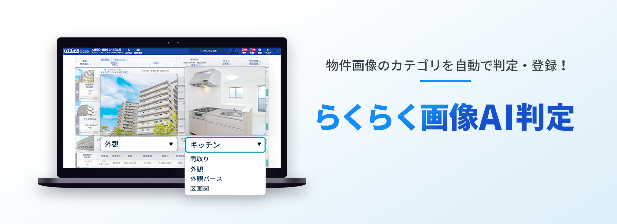 「らくらく画像AI判定」は、登録された物件画像のカテゴリを自動判定する機能です。画像のカテゴリをその都度探して選択する必要はなく、ドラッグ&ドロップで画像をアップロードすると同時にカテゴリ分けが完了します。本機能には、深層学習(ディープラーニング)を用いたAIを利用しておりカテゴリの判定のみならず、それに基づくコメントまでも自動生成することも可能です。
