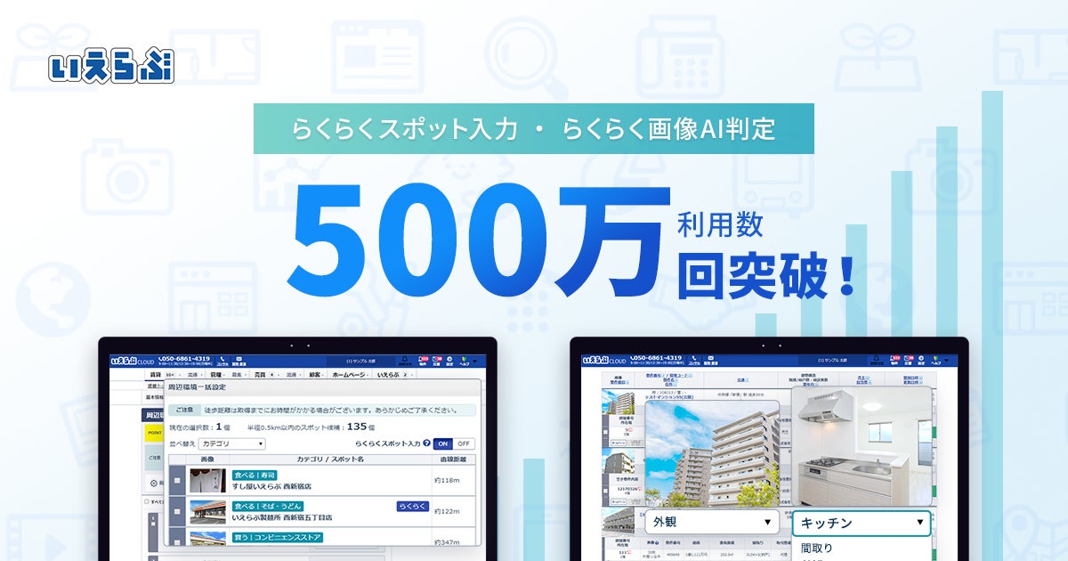 不動産テックに特化したバーティカルSaaSなどの開発を行う株式会社いえらぶGROUP(以下、いえらぶGROUP)が提供する「いえらぶCLOUD」にて、物件周辺環境の入力を自動化する「らくらくスポット入力」機能と、物件入力業務を効率化する「らくらく画像AI判定」機能の利用回数が500万回を突破しました。