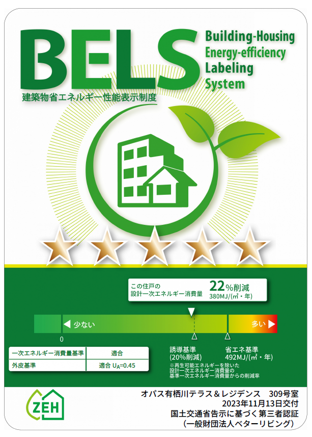 国土交通省が定めた「建築物の省エネ性能表示ガイドライン」に基づく第三者認証制度の1つであるBELSにおいて、最高評価5つ星の認定を取得いたしました。住宅用途の建物では一次エネルギー消費量20%以上削減で5つ星評価となりますが、本住戸は一次エネルギー消費量22%の削減に成功しています。