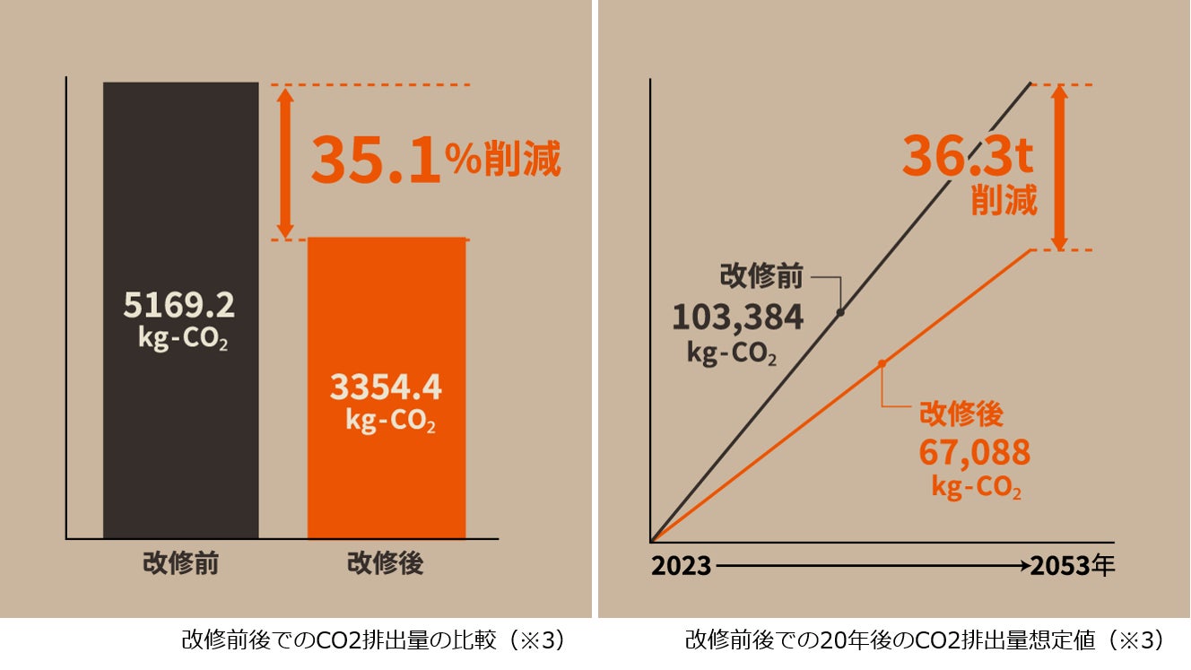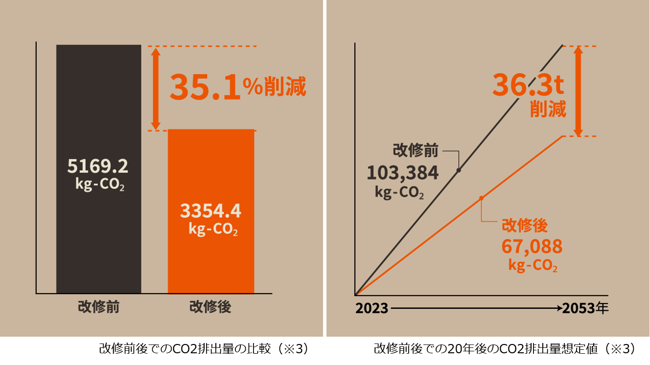 リノベーション後の冷暖房や水道光熱費にかかるCO2排出量は、シミュレーション上で年間35.1%を削減。20年後には36.3tもの削減につながると予測されており、長く住むことが環境に対する貢献にもなります。