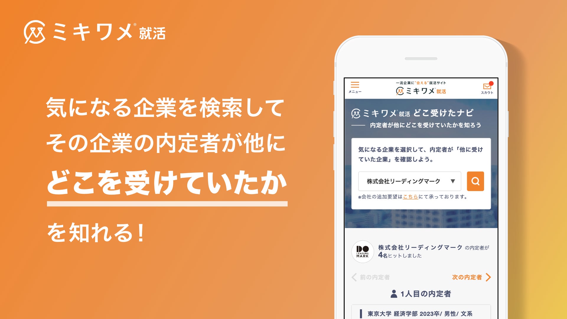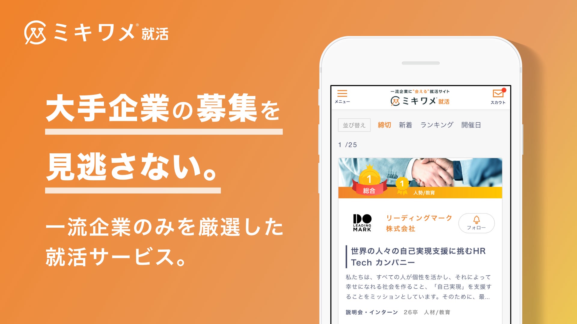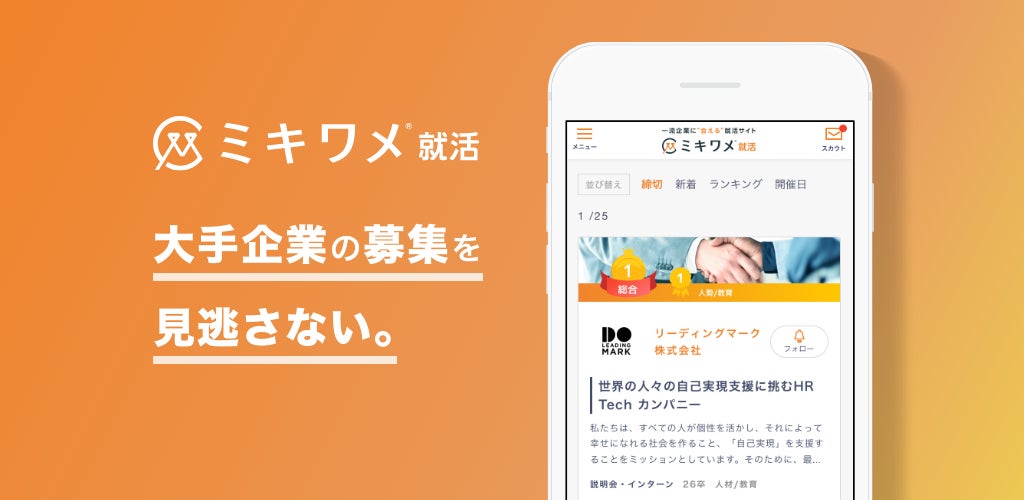 新卒採用支援やPersonality Techを通じたHR事業「ミキワメ」を提供する株式会社リーディングマーク(本社:東京都港区、代表取締役社長:飯田 悠司) は、2024年7月9日に「大手・Top企業の募集を見逃さない!」を叶える最上位校生向け就活サイト「ミキワメ就活」Android版アプリをリリースしました。