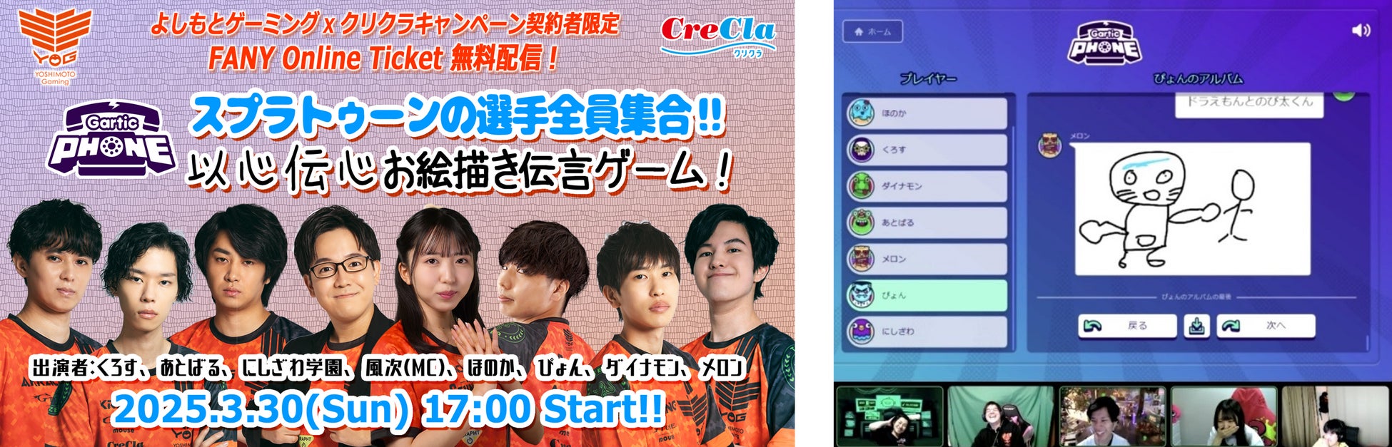 概要:よしもとゲーミング所属選手がクリクラ契約者様のみ視聴可能な生配信を実施。以心伝心お絵描き伝言ゲームを実施するなど、普段では見られない見どころ満載の配信。今年度も実施を検討しております。