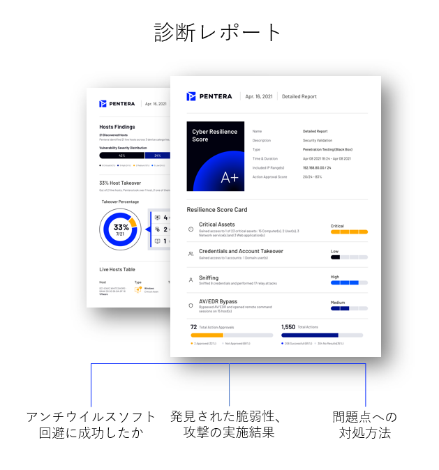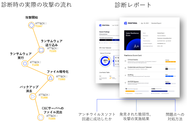 自社システムの脆弱性を調査し、パスワードクラック・リレーアタック・マルウェア注入・特権エスカレーションなどの一連の攻撃を連続的に仕掛けることでシステムのリスクを洗い出し、テスト結果と対策方法のレポート作成までを自動で行います。