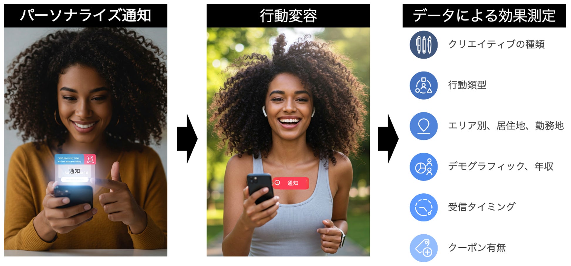 タに基づいた通知配信後の効果検証を実施。クーポン配信により、駅ナカ施設への来訪頻度や時間帯の変化、属性・行動傾向ごとの反応の違いなど、通知がどのように行動に影響を与えたかを可視化しまし