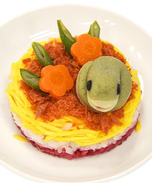 2025年の干支「巳」をじゃがいもで作って飾りつけた押し寿司。1層目と2層目のご飯は、おめでたい新年にふさわしい紅白色にし、間には「縁起物」とされる鯛のほぐしみが入っています。素敵な一年になるよう想いを込めて作りました。(内容量:100g、サイズ:直径約8cm×高さ2cm、価格:1,100円(税込)、原産国名:日本)