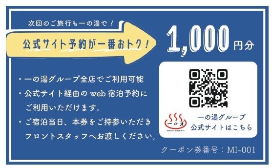 次回ご予約の際に一の湯公式WEBサイトからご予約していただくだけで、1,000円分が割引となるクーポン券です。期間限定キャンペーンの際にお越しいただき、次の旅行の際も箱根をお得に満喫してください!