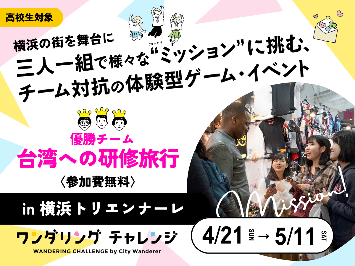 ワンダリングチャレンジは、2013年に台湾のNGO City Wandererによって生み出された、チーム対抗の体験型ゲーム・イベントです。現在では日本を始め、台湾・マレーシア・中国・香港など22都市で開催され、のべ1万人以上の若者が参加しています。今回は、横浜市で3年に一度開催する現代アートの国際展『第8回横浜トリエンナーレ「野草:いま、ここで生きてる」』と共同で開催します。高校生は、横浜美術館があるみなとみらい地区を舞台に3人1チームで、さまざまなミッションに挑みます。