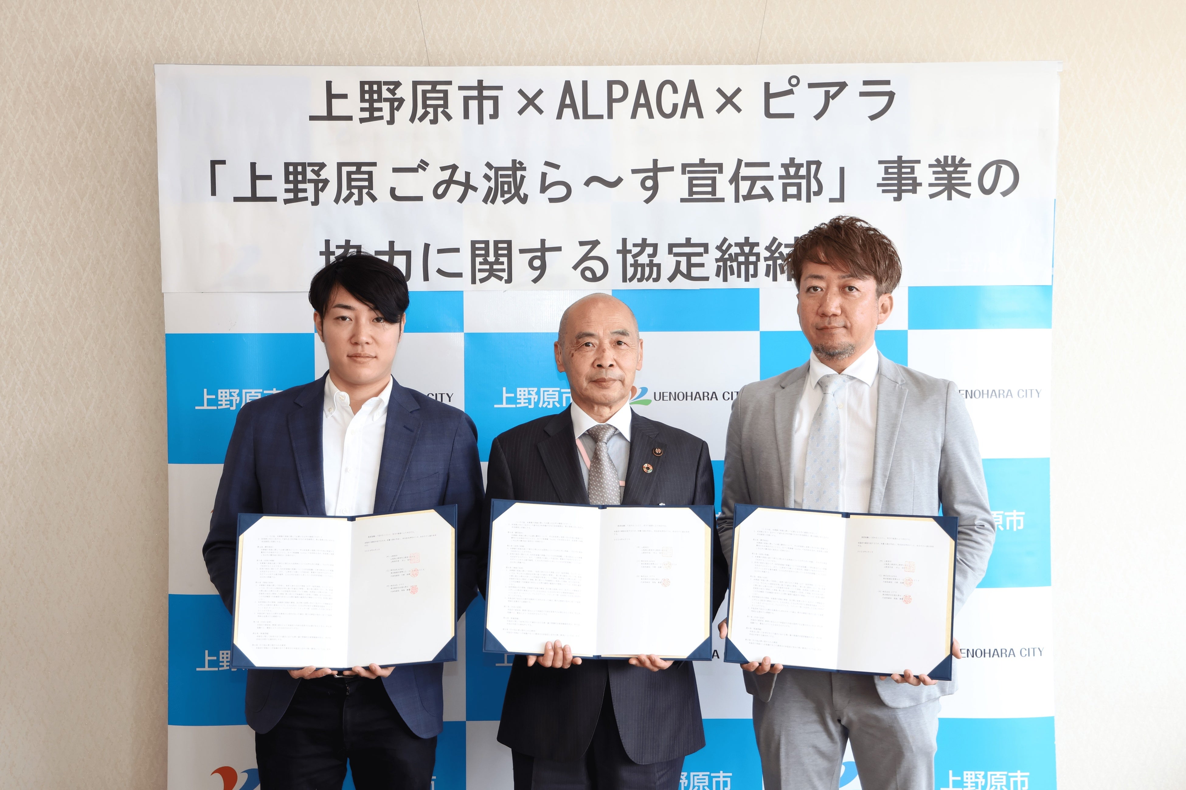 山梨県上野原市のゴミ減量対策事業「上野原ごみ減ら~す宣伝部」を通じてゴミの減量化・再資源化を推進 全国初の取組みALPACA・上野原市・ピアラの3者による連携協定を締結