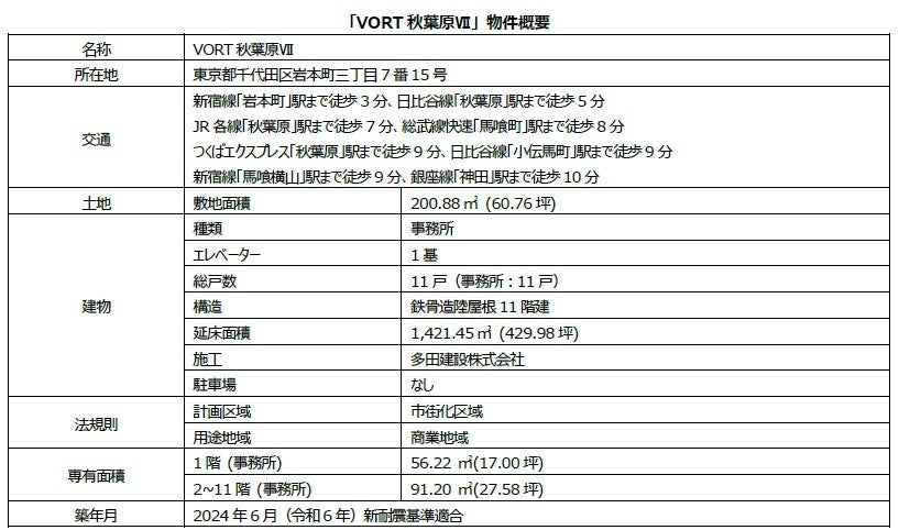 「区分所有オフィス®」を主軸に資産形成コンサルティングを行う株式会社ボルテックス(東京都千代田区 代表取締役社長 兼 CEO 宮沢 文彦、以下当社)は、「VORT秋葉原Ⅶ」を取得しました。