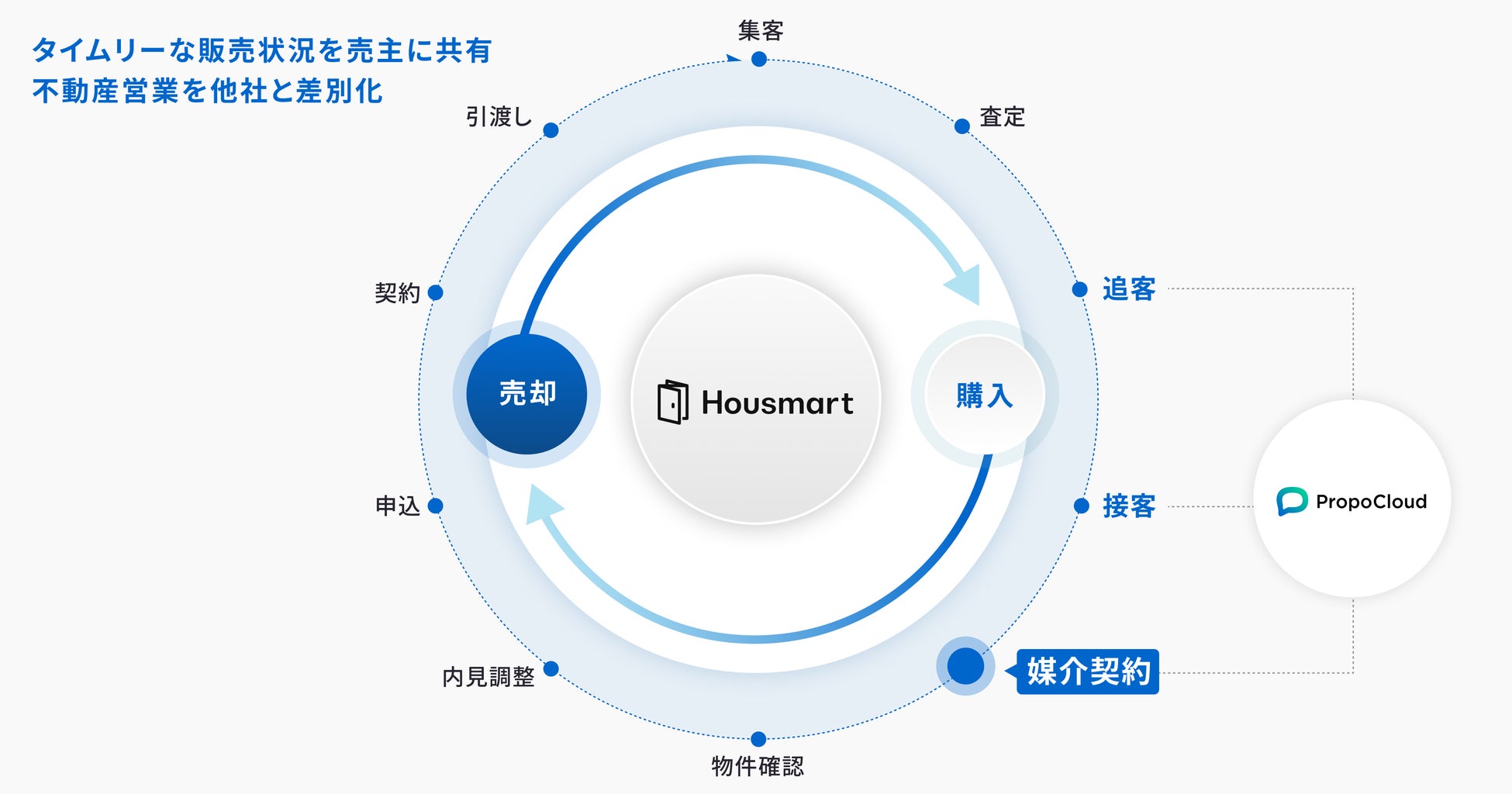 株式会社Housmart(以下「ハウスマート」)は、2025年3月上旬より、不動産売買仲介会社(以下「仲介会社」)に向けて、「PropoCloud(プロポクラウド) 媒介契約管理」の提供を開始いたします。この機能により仲介会社は、Web上で販売状況を一元管理し、媒介契約を結んだ物件売却希望者(以下「売主」)へ共有ができるため、両者間のコミュニケーションコストを削減、より高頻度な情報の共有が実現します。