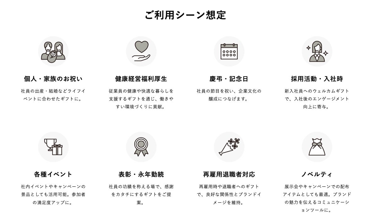 福利厚生(出産・結婚祝い):ライフイベントに寄り添うギフトで、会社からの祝福を伝達。家族にも喜ばれるアイテムを提案します。