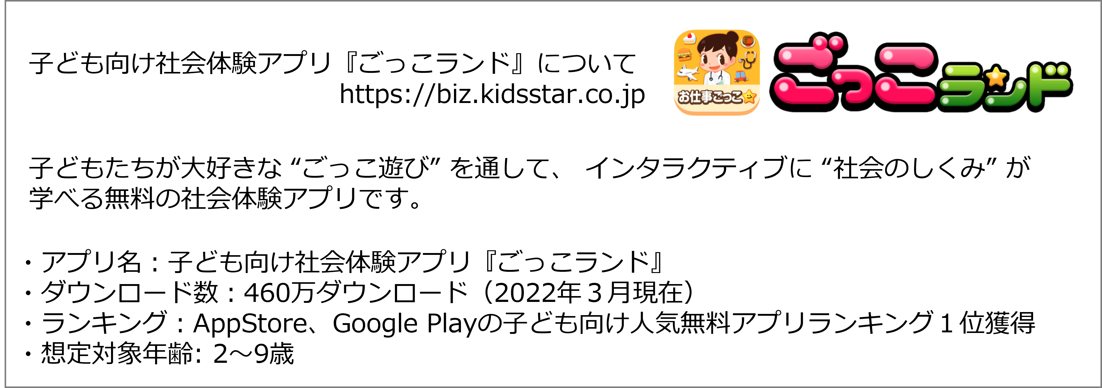 ・アプリ名:⼦ども向け社会体験アプリ『ごっこランド』