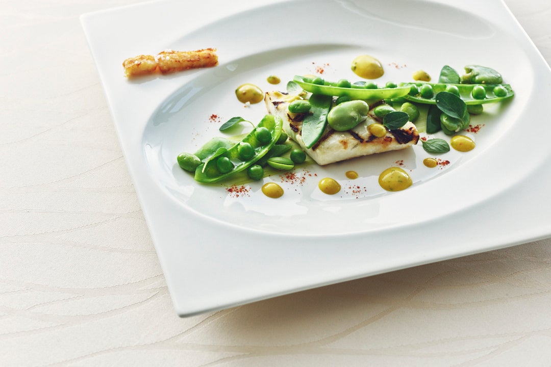 サメガレイのグリル 緑豆のフリカッセ 瀬戸内レモンサルモリッリオソース