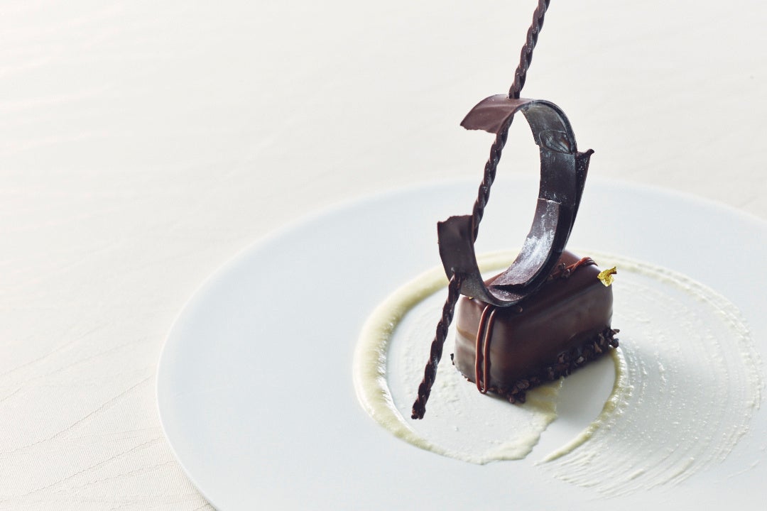アートディナーではロビーの作品をそのままに、チョコレートで彫刻を表現しピュアチョコレートにデコレーションしました。耳をすませば音楽が聞こえてきそうなエレガントなデザートプレートです。