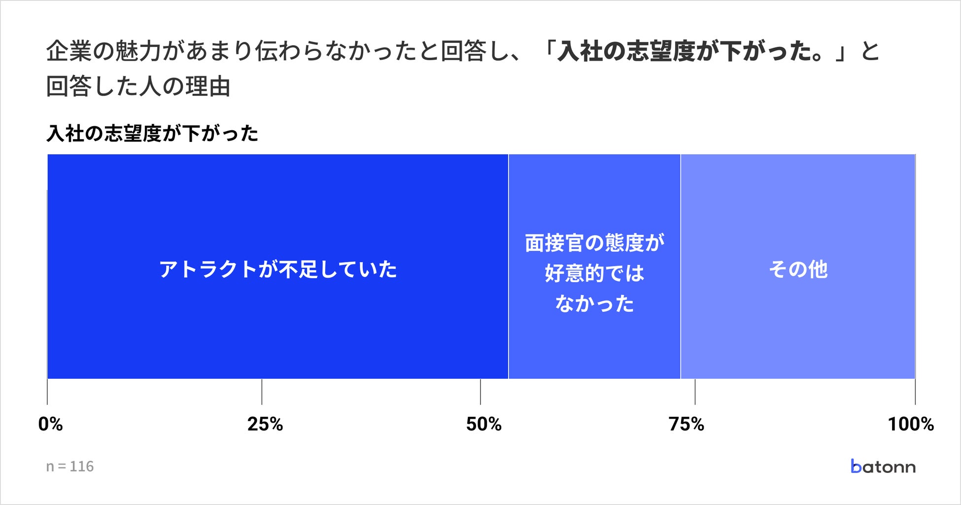 面接時に企業の魅力が伝わらなかったと回答した学生にその後の志望度の変化を聞いたところ、全体の33.3%が企業の志望度が下がったと回答。その理由としてアトラクト不足を挙げた学生が53.3%となるなど、面接担当者の態度などよりも多く、アトラクトの不足こそが学生の志望度を下げる要因になっていることが分かりました。