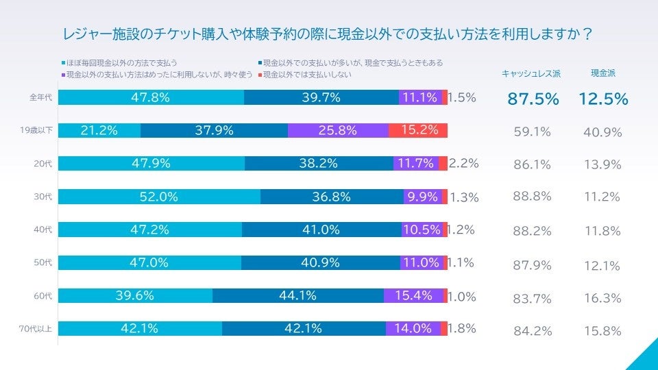 レジャー施設のチケット購入、アクティビティなどの体験における支払いについて、87.5%が「現金以外で支払うことが多い」キャッシュレス派であると回答しました。世代別では30代・40代が88%を越え、他世代よりキャッシュレス利用率が高いことが分かりました。