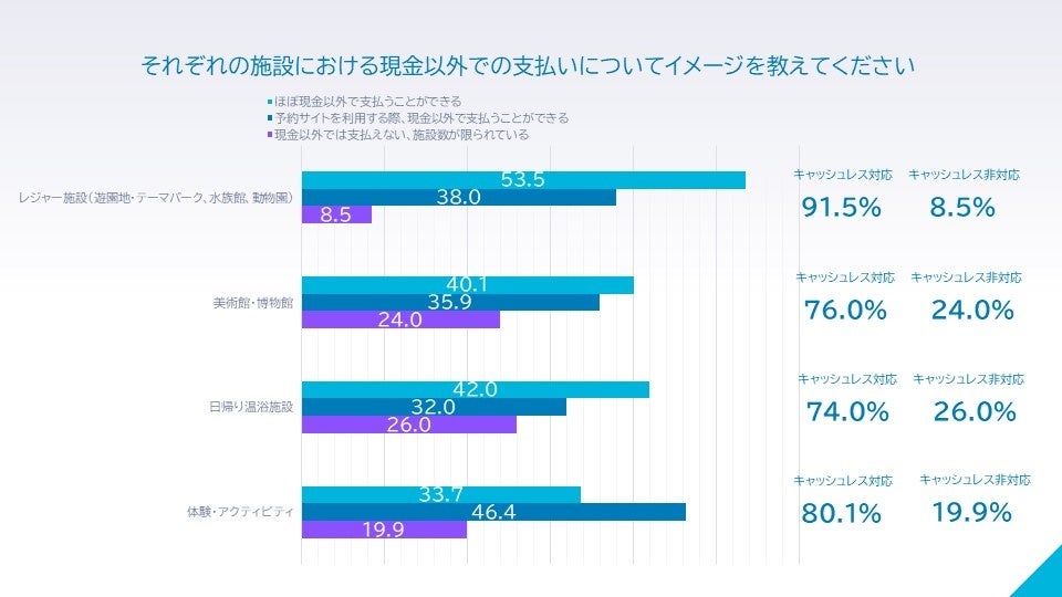 施設のキャッシュレス対応「できている」80.4%、大型レジャー施設は91.5%。一方、文化施設や日帰り温泉「できていない・数少ない」約25%