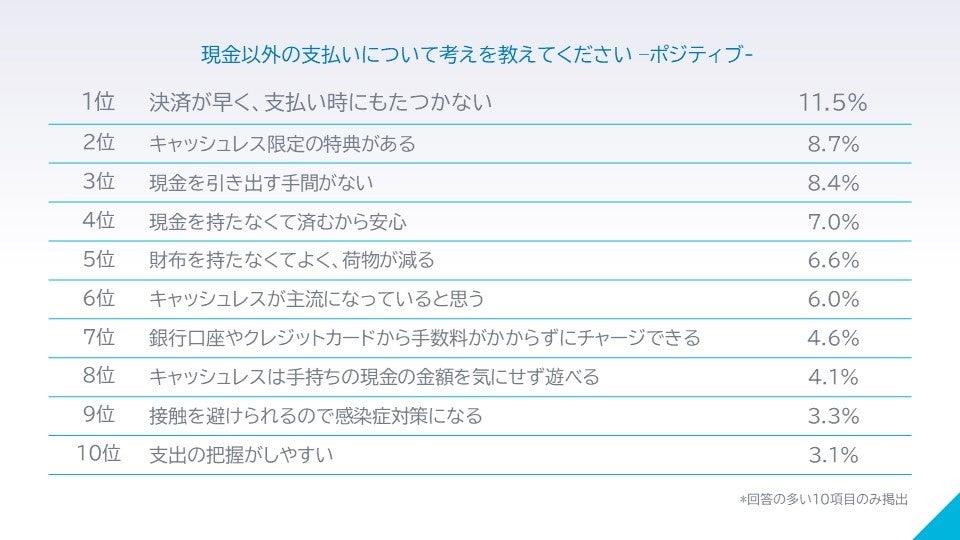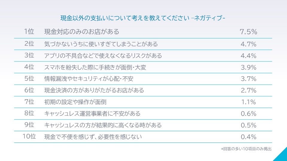 キャッシュレス決済に関するイメージについて、ポジティブな考えの1位は「決済が早く、支払い時にもたつかない」、2位が「キャッシュレス限定の特典がある」、3位が「現金を引き出す手間がない」と続きました。ネガティブな考えの1位は「対応している店・施設が限られる」、2位が「気づかないうちに使いすぎてしまう」、3位が「アプリの不具合などで使えなくなるリスクがある」との回答でした。