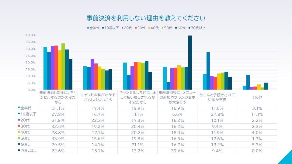 世代ごとでも不安視するポイントが異なり、20代では「きちんと手続きがされているか不安だから」、70代には「事前決済後の追加・変更が大変そうだから」といった理由が他世代より高い傾向がみられました。「その他」理由では、事前決済の意向はあるものの「利用する施設・店、プランが事前決済に対応していないため」が最多となりました。