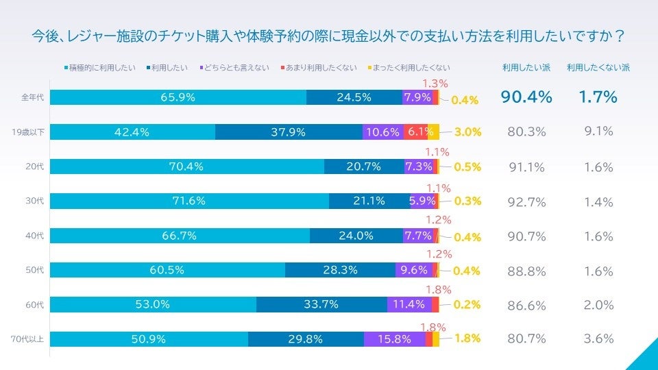 キャッシュレス支払いの意向調査においては、90.4%が「利用したい」と回答。特に20代~40代は全年代の平均を上回り、現金を使わずキャッシュレス決済の利用意向が高いことが分かりました。一方、19歳以下は「利用したくない」の回答が9.1%と、他世代に比べて意向が低い傾向が見て取れます。