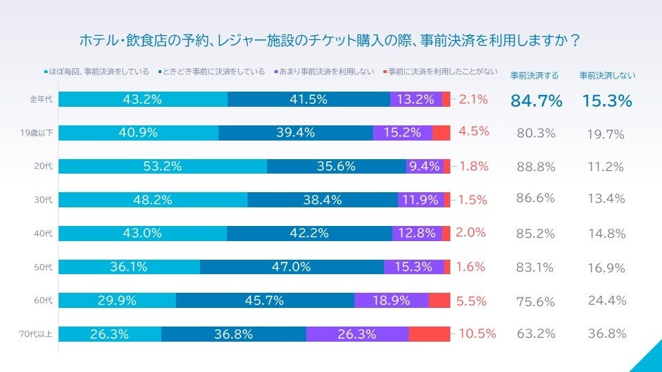 事前決済「する」84.7%、20代「ほぼ毎回する」53.2%で世代別1位。しない理由は「決済後のキャンセルが大変」。