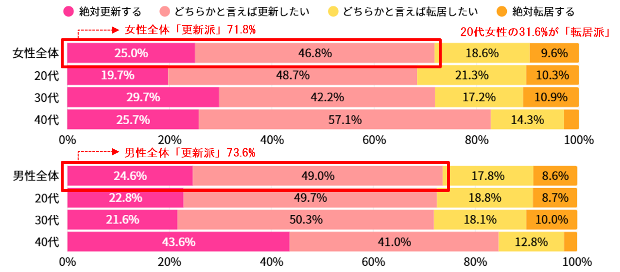 男女ともに更新派が7割以上で、特に40代男性では絶対更新する人が43.6%と、住み慣れた環境での暮らしを継続したいという意向が予想されます。対して転居希望者では20代女性が31.6%とやや高い傾向で、男女ともに20,30代の方がライフスタイルの変化や、現在の住環境をより良いものにしたいというステップアップ思考が感じられます。