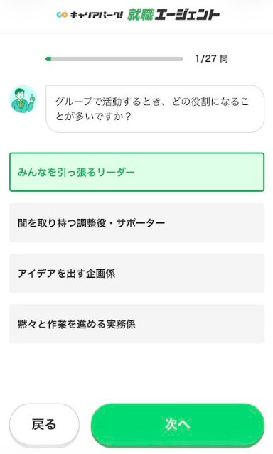 「強み」「価値観」「興味」を測るための27問の設問に答えていきます。直感的に回答できる4択形式のため、短時間で負担なく進めることができます。