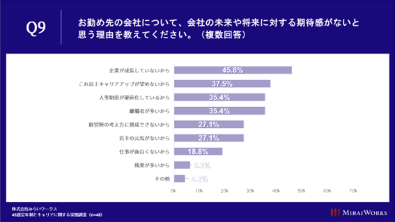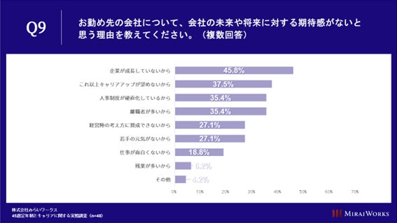 Q7で「あまりない」「全くない」と回答した方に、「Q9.お勤め先の会社について、会社の未来や将来に対する期待感がないと思う理由を教えてください。(複数回答)」(n=48)と質問したところ、「企業が成長していないから」が45.8%、「これ以上キャリアアップが望めないから」が37.5%、「離職者が多いから」が35.4%という回答となりました。