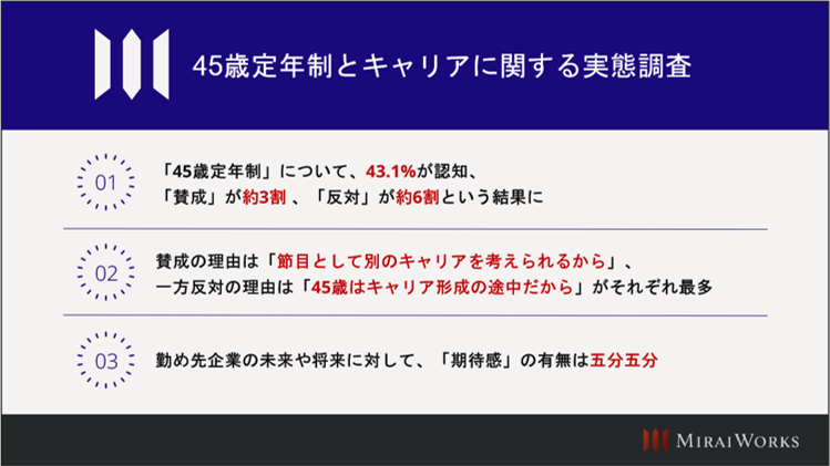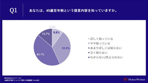 プロフェッショナル人材のフリーランス・副業といった多様な働き方をサポートする株式会社みらいワークス(本社:東京都港区、代表取締役社長:岡本祥治、証券コード:6563)は、2023年度(2023/4/1~2024/3/31)に45歳を迎え、大企業(1,000名以上)で総合職相当の正社員として勤務するビジネスパーソン102名を対象に、45歳定年制とキャリアに関する実態調査を実施いたしましたので、お知らせいたします。