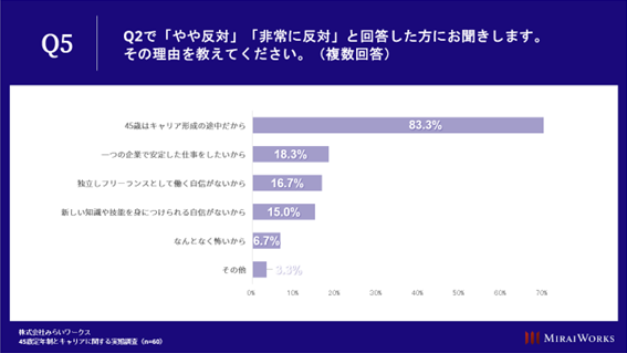 Q2で「やや反対」「非常に反対」と回答した方に、「Q5.その理由を教えてください。(複数回答)」(n=60)と質問したところ、「45歳はキャリア形成の途中だから」が83.3%、「一つの企業で安定した仕事をしたいから」が18.3%、「独立しフリーランスとして働く自信がないから」が16.7%という回答となりました。