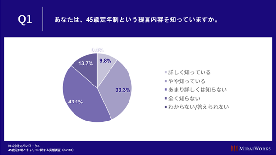 「Q1.あなたは、45歳定年制という提言内容を知っていますか。(45歳定年制とは、2021年にサントリーホールディングスの新浪剛史社長が、『(定年が)45歳になると、30歳・35歳で勉強する。自分の人生を考えるようになる』と発言した内容を指しています)」(n=102)と質問したところ、「詳しく知っている」または「やや知っている」が43.1%、「あまり詳しくは知らない」または「全く知らない」が56.8%という回答となりました。