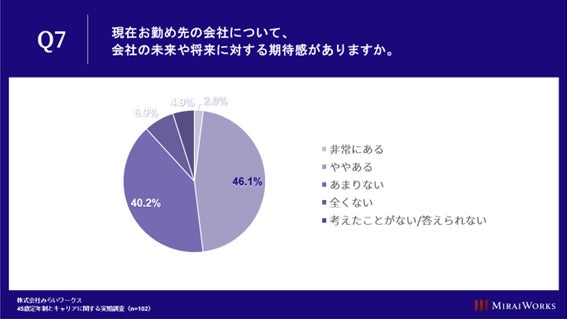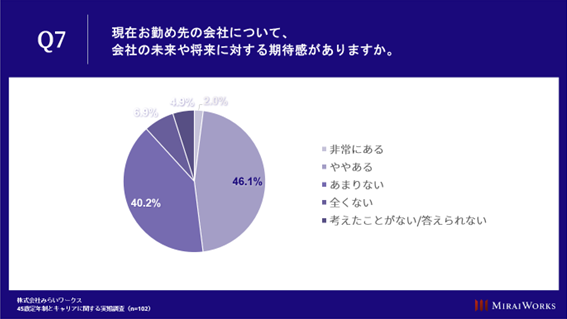 「Q7.現在お勤め先の会社について、会社の未来や将来に対する期待感がありますか。」(n=102)と質問したところ、「非常にある」または「ややある」が48.1%、「あまりない」または「全くない」が47.1%という回答となりました。