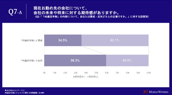 「Q2.「45歳定年制」の内容について、あなたは賛成・反対どちらの立場ですか。」という質問に対する回答別に、「Q7.現在お勤め先の会社について、会社の未来や将来に対する期待感がありますか。」という質問への回答を集計したところ、Q2で「非常に賛成」または「やや賛成」と回答した方については34.5%が期待感について「非常にある」または「ややある」、Q2で「やや反対」または「非常に反対」と回答した方については58.3%が期待感について「あまりない」または「全くない」という回答となりました。