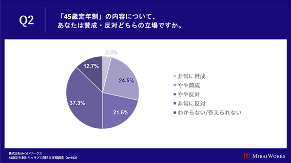 「Q2.「45歳定年制」の内容について、あなたは賛成・反対どちらの立場ですか。」(n=102)と質問したところ、「非常に賛成」または「やや賛成」が28.4%、「やや反対」または「非常に反対」が58.9%という回答となりました。