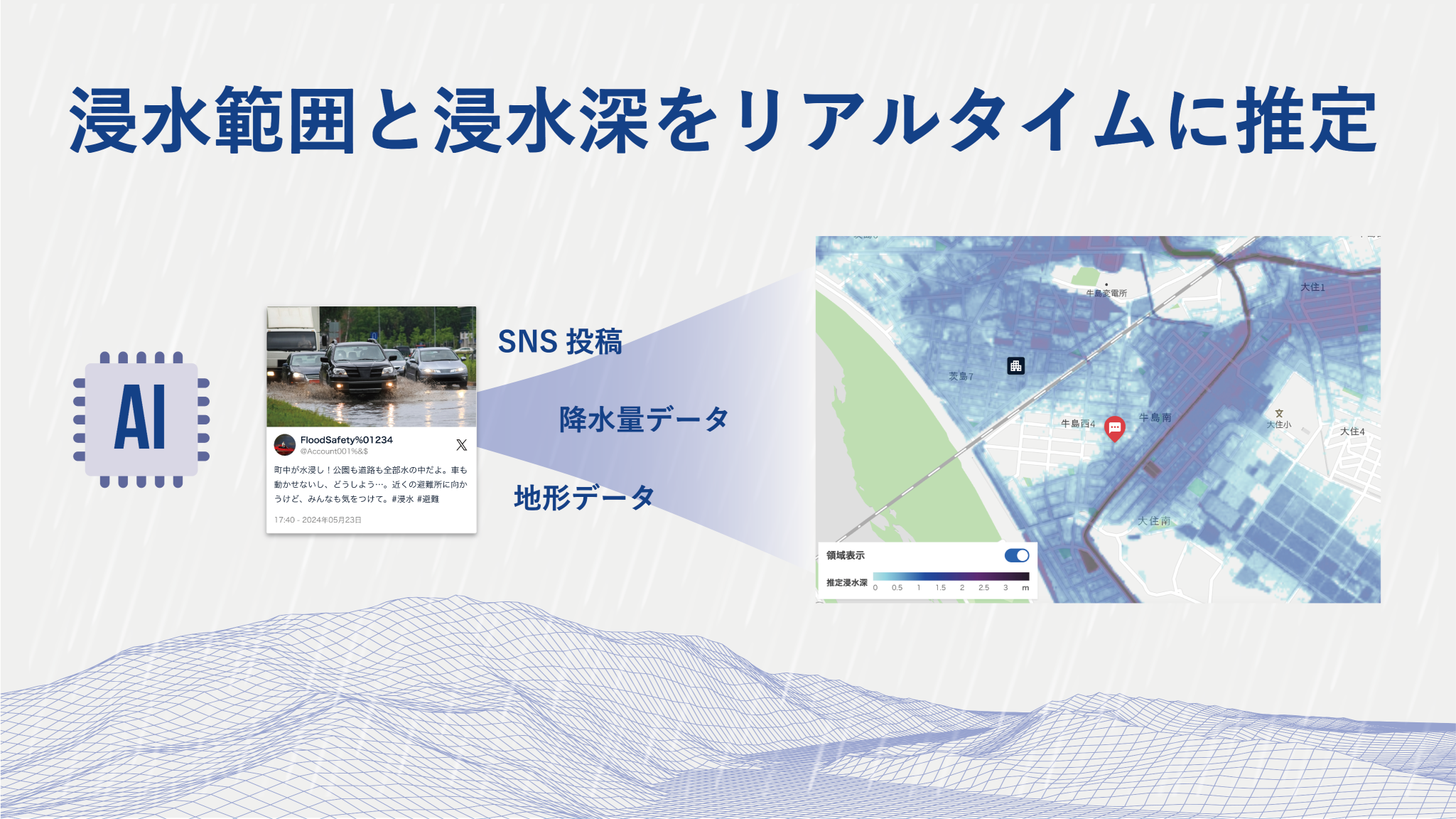 一方で、水害は突発的な地震とは異なり、「進行型」の災害であるため、事前に自社のリスクの高まりを覚知し、準備する猶予があることが特徴です。そこで、Specteeでは、強みである「SNS情報の収集」と「AI解析」を活かし、2021年、水害のリスクを可視化する「リアルタイム浸水推定」を開発しました。