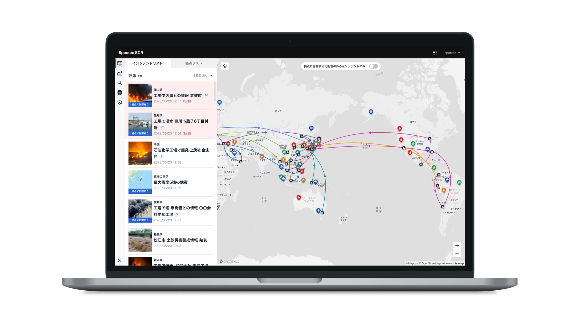 また、2023年11月には製造業向けのサプライチェーン・リスク管理サービス『Spectee Supply Chain Resilience』の提供を開始しました。製造業などのサプライチェーンを見える化するとともに、SNS・気象データ・全世界のローカルニュースや地政学リスク情報など様々なデータをリアルタイムに解析し、サプライヤー周辺で起こる危機を瞬時に覚知し、サプライヤーの被害状況や製品への影響、納期の遅れなどを迅速に把握することが可能になります。