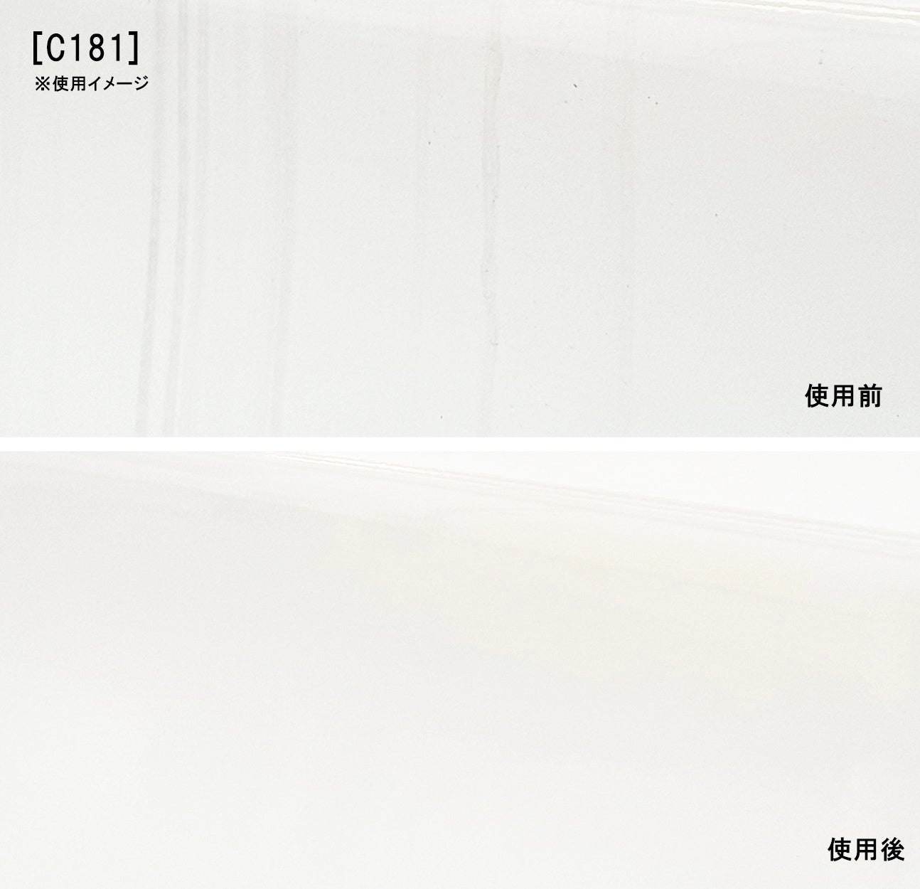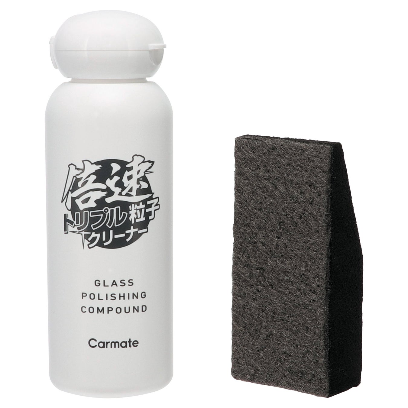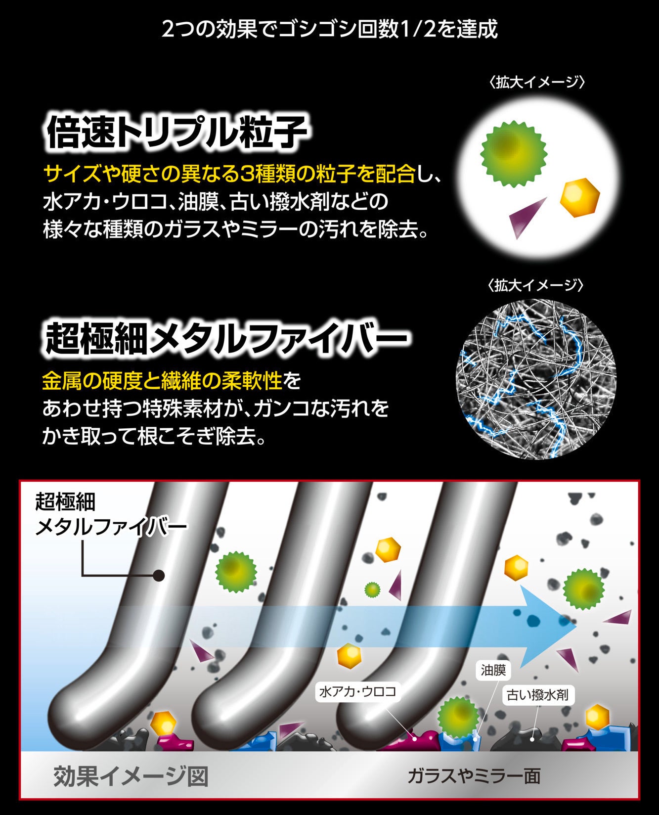 サイズや硬さの異なる3種類の粒子を配合し、水アカ・ウロコ、油膜、古い撥水剤などの様々な種類のガラスやミラーの汚れを除去します
